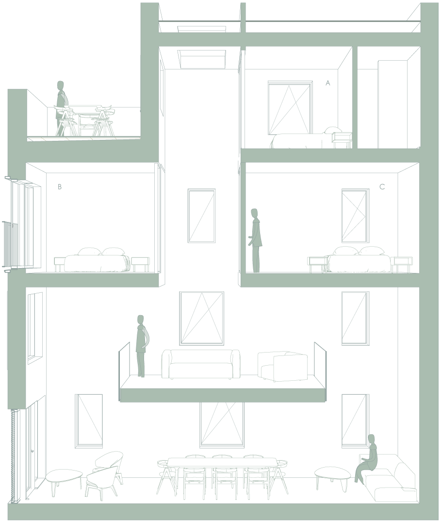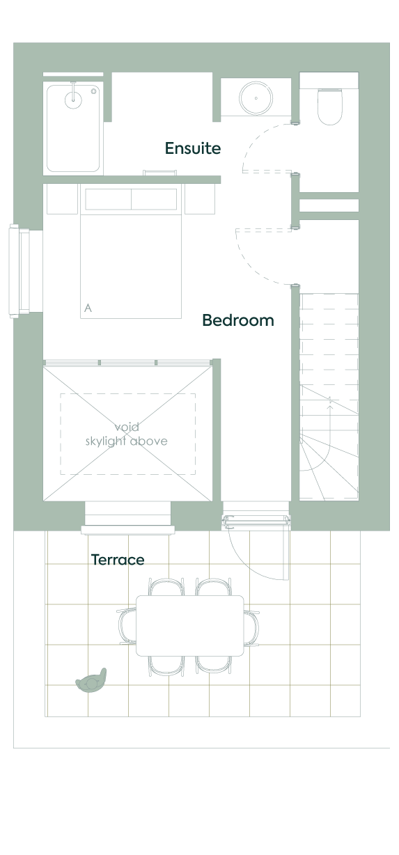 The top floor forms a tranquil master suite, complete with dressing area, en-suite, and private roof terrace—perfect for morning coffee or evening calm.