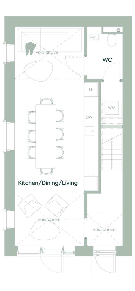 A double-height entrance sets the tone for the light-filled journey through the home. The ground floor features a seamless kitchen and dining space opening onto a riverside terrace, where light voids draw daylight deep within.