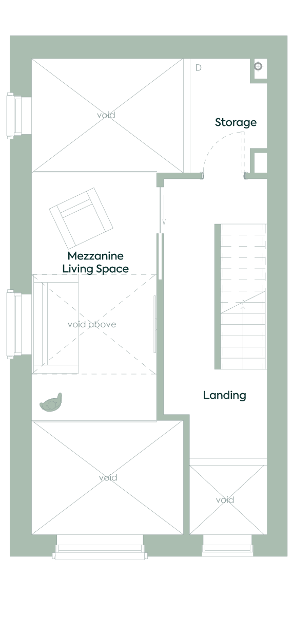 The first-floor mezzanine living area floats within a triple-height void, bathed in soft light from an overhead rooflight. A snug to the rear offers a private yet connected retreat.