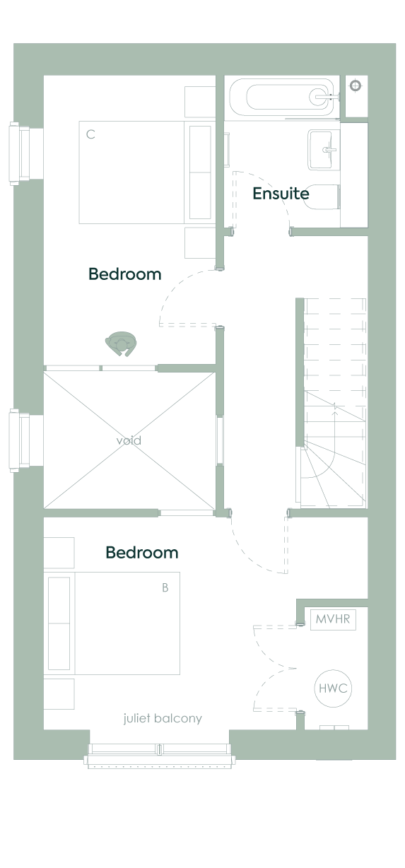 Two double bedrooms and a family bathroom occupy the second floor, with internal glazed screens overlooking the central void. The main bedroom includes a Juliette balcony with views across the river and city skyline.