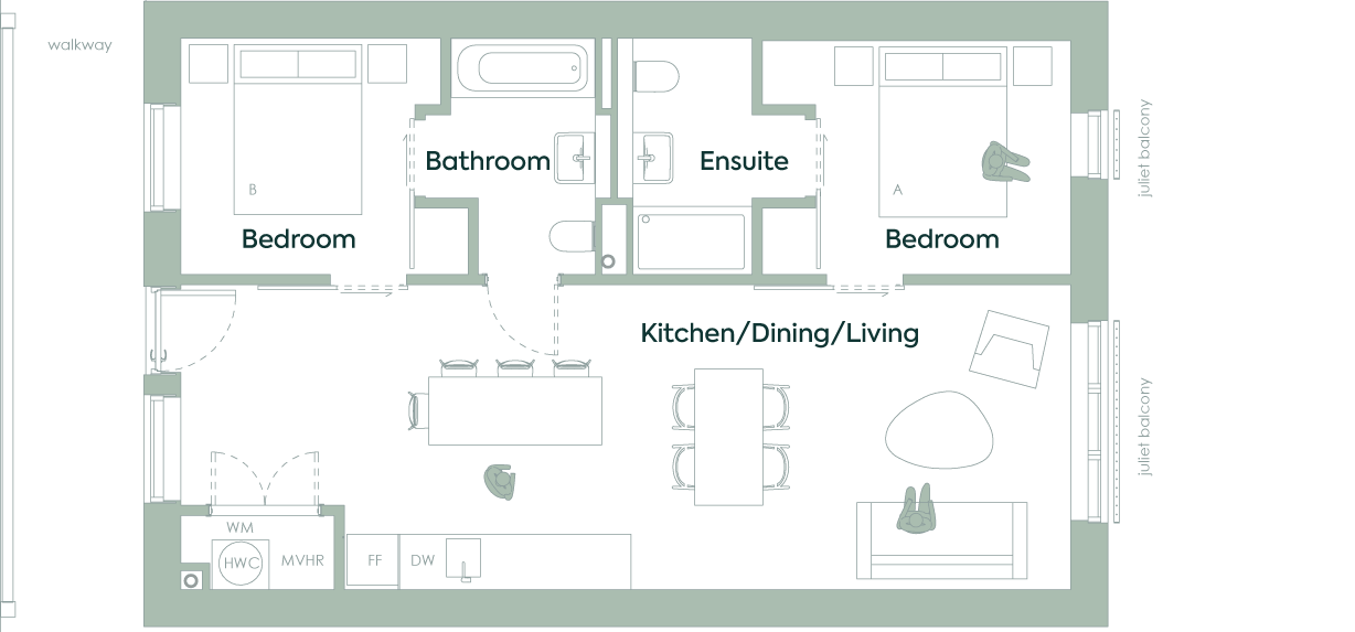 Orchard Lofts marks a new milestone at the Climate Innovation District, the very first timber-framed apartments in the neighbourhood. Each home has been carefully designed to blend contemporary living with a strong connection to the outdoors. Expansive picture windows, Juliet balconies, and views across the fruit trees of Spring Green bring light, greenery and a sense of calm into everyday life.